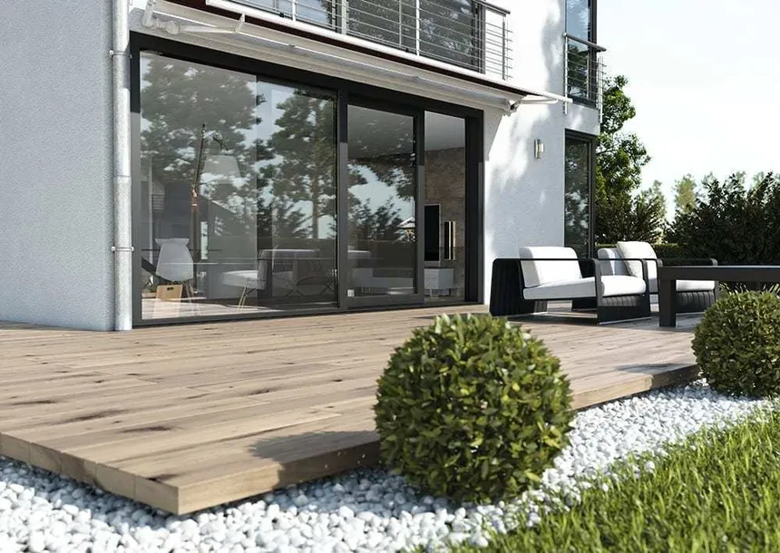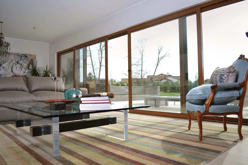 El sistema permite crear construcciones de hasta 6,5 metros de anchura. Esto permite sustituir toda una pared del salón por una salida panorámica transparente hacia la piscina.