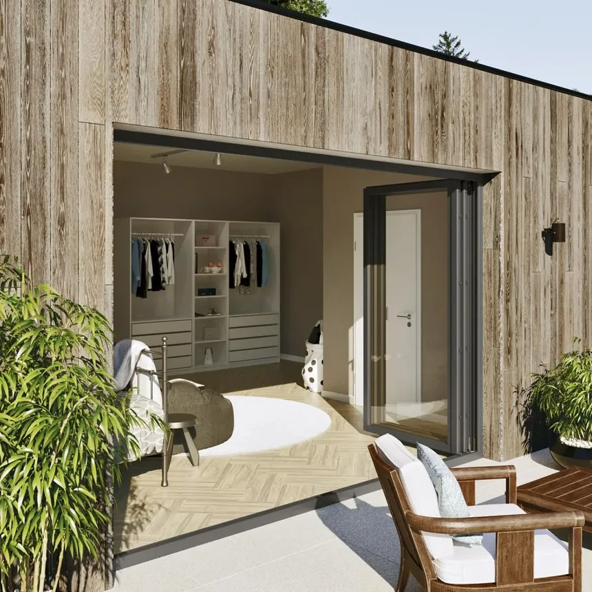 A diferencia de los sistemas plegables, aquí las hojas no están conectadas por bisagras. Cada panel se mueve independientemente a lo largo de un carril, gira y se aparca en la esquina. Esto le permite: