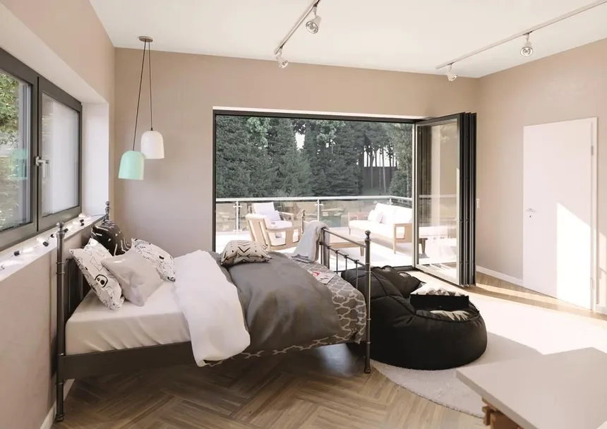 - Herrajes: Herrajes especializados ocultos Panorama Swing que aseguran un movimiento suave del panel a lo largo de los raíles.