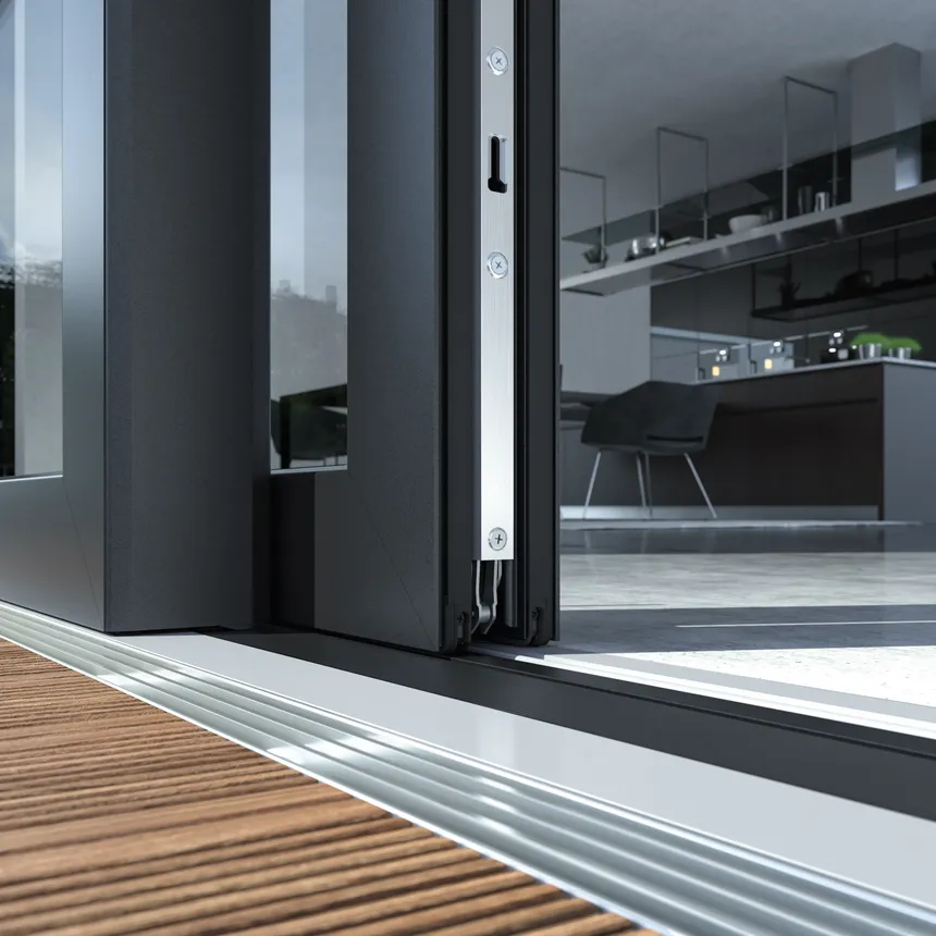 Las hojas de hasta 400 kg de peso se deslizan prácticamente sin ruido y se controlan con una mano. Es la mejor solución para salidas a terraza en casas de campo, donde importa el máximo aislamiento térmico y la protección contra corrientes en invierno.