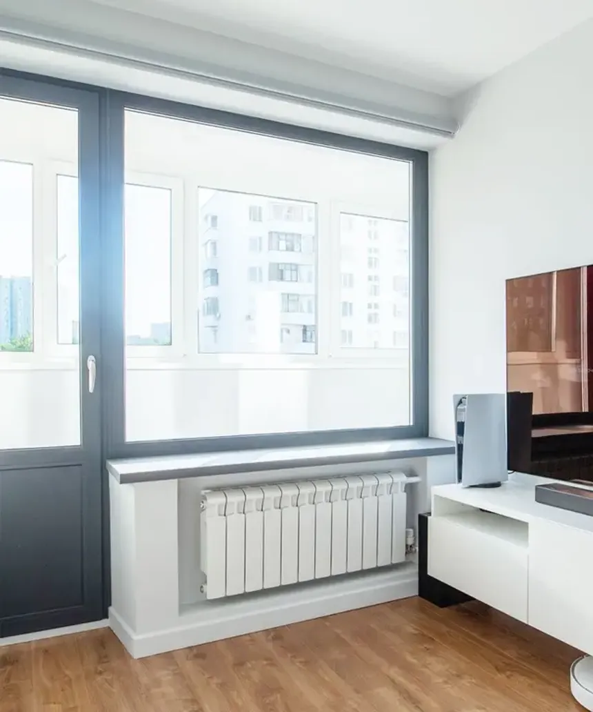 Снимаем старые рамы аккуратно и берём вынос мусора на себя. Проверяем парапет и основание, при необходимости усиливаем конструкцию для безопасной установки тёплых окон.